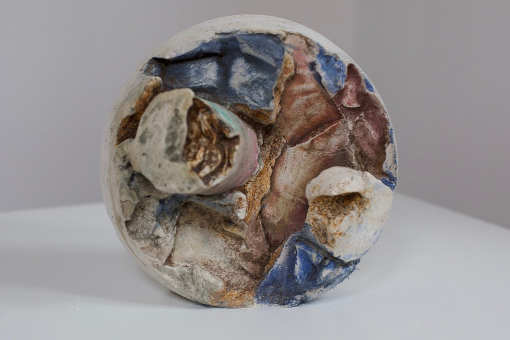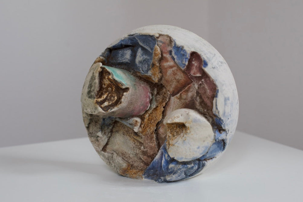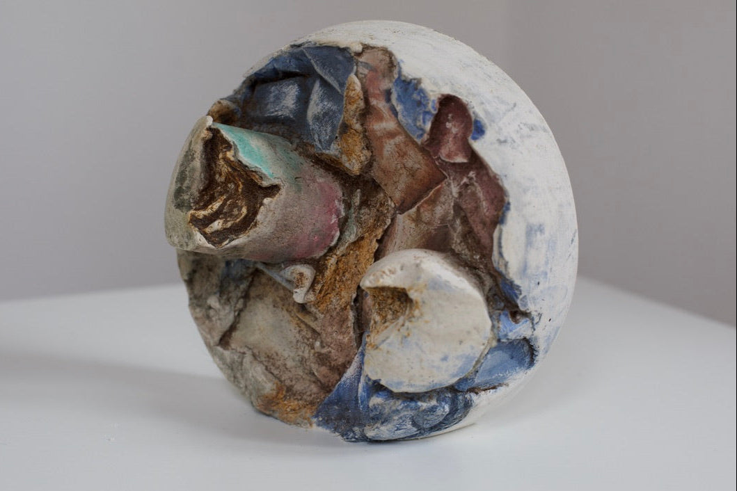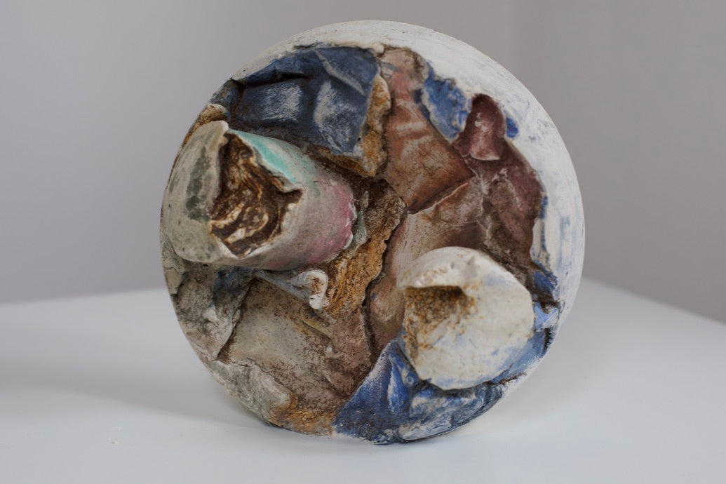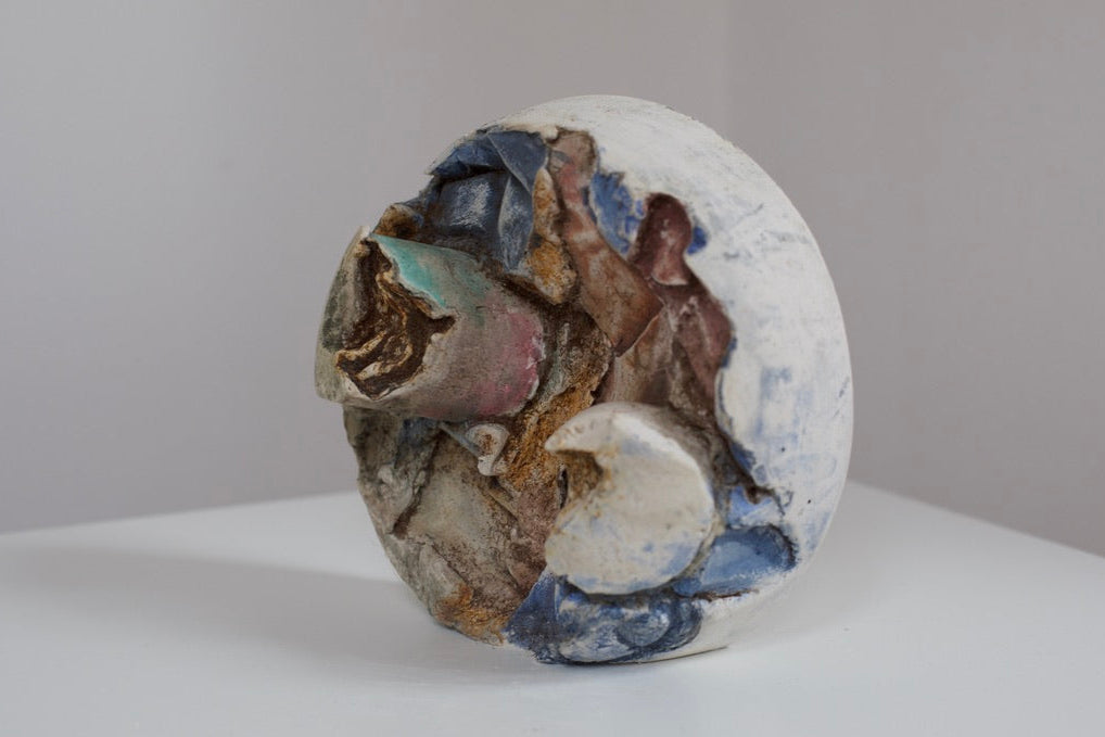 Suspended between solidity and dissolution, this cast Gypsum Bas-Relief leans into space, its raw, fractured surface absorbing delicate aquarelle pigments.